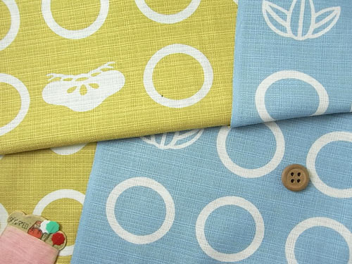 和風コットン生地・京染もめん リバーシブル丸と松竹梅(水色/菜種油色)衣装・和雑貨に■綿100% ■約110cm幅 ■厚み約0.36mm 生地の上のボタンは直径約2cmです。